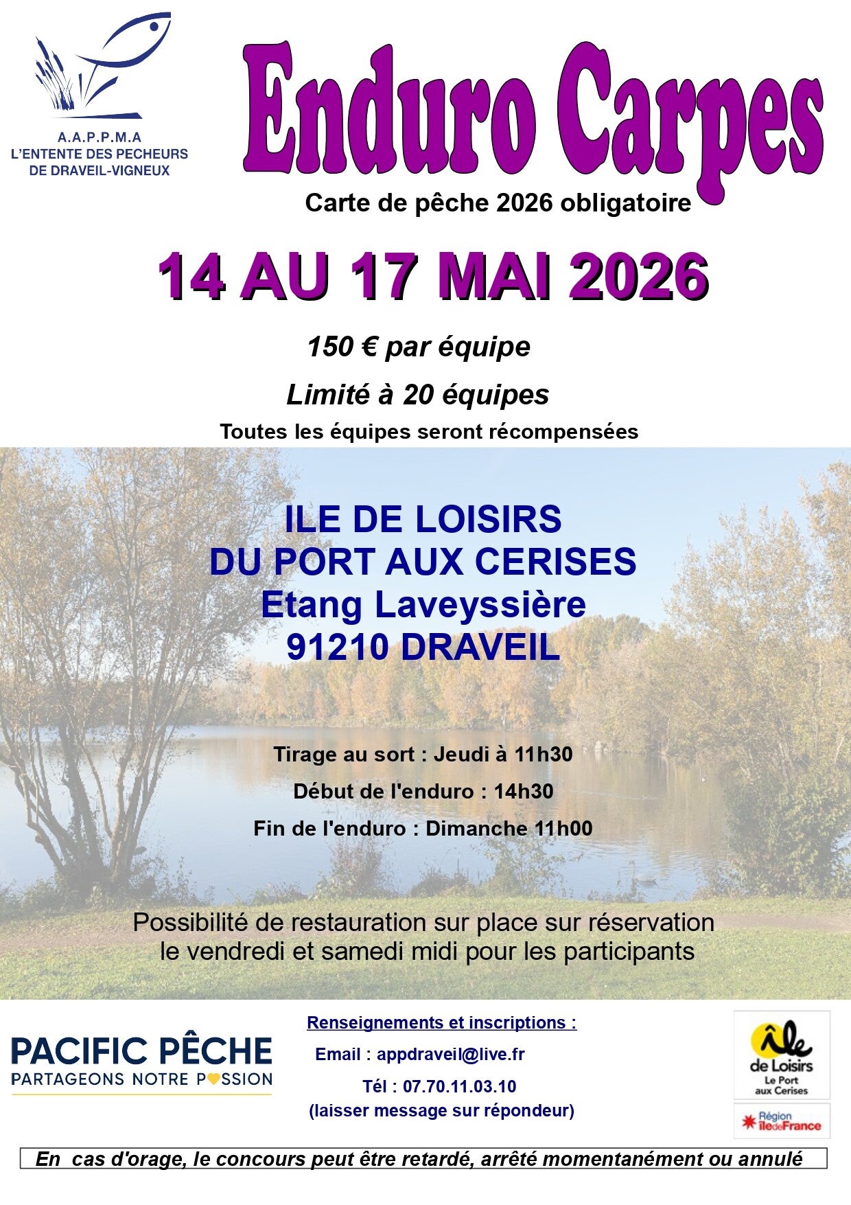 Un Enduro Carpes est organisé du 17 au 20 mai 2024 regroupant 20 équipes de 2 pêcheurs tout autour du plan d'eau de l'Etang Laveyssière, site l'Ile de Loisirs du port aux cerises à Draveil.